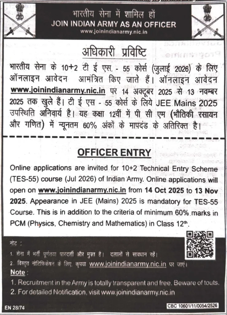 Join Indian Army – Join Indian Army has released the Army 10+2 TES 55 Recruitment 2025 notification for the Technical Entry Scheme July 2026 Batch. The online application process will begin on 14 October 2025, and candidates can apply till 13 November 2025 through the official website. A total of 90 vacancies have been announced for eligible unmarried male candidates who have passed 10+2 with 60% marks in PCM and appeared in JEE Main 2025. This is a great opportunity to join the Indian Army as a commissioned officer.