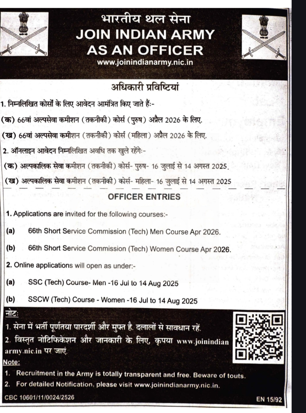 Discription: Indian Army ne Short Service Commission (SSC) ke under male aur female candidates ke liye 381 posts ke liye bharti notification release kiya hai. Jo candidates B.Tech degree kisi recognized institute se complete kar chuke hain aur defence sector me career banana chahte hain, unke liye yeh ek achhi opportunity hai. Is Army SSC Recruitment 2025 ke liye online form bharne ki process 16 July 2025 se start ho chuki hai, aur 14 August 2025 raat 11 baje tak aap apply kar sakte hain. Eligibility jaise qualification, age limit, aur selection process ki complete info neeche table me di gayi hai. Notification download karne ka direct link bhi available hai.