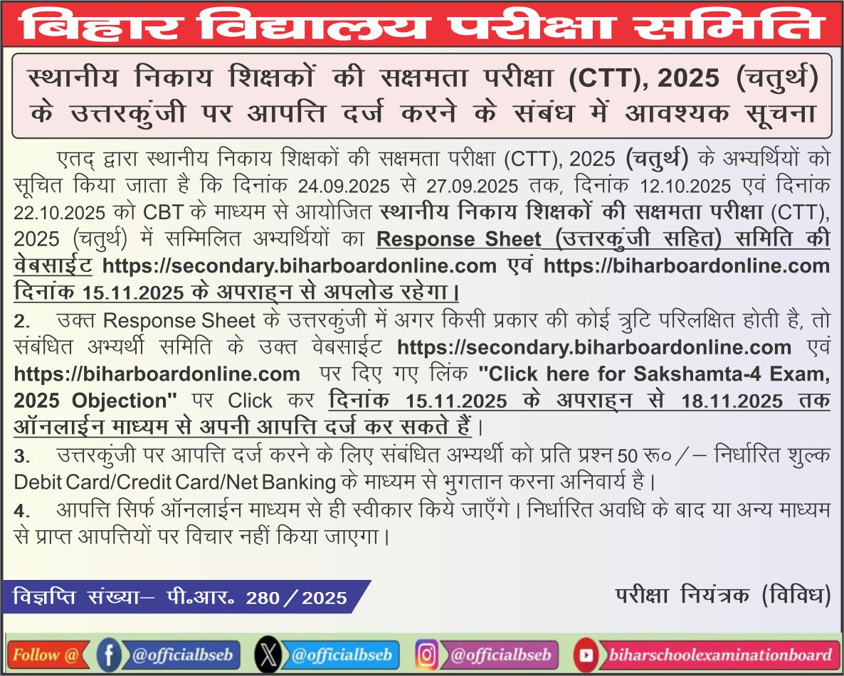 Bihar School Examination Board (BSEB) – The Bihar School Examination Board (BSEB) has conducted the Sakshamta Pariksha CTT 4th Phase Examination on 24 September 2025 for eligible teachers across the state. Candidates who appeared in this test can now check the latest update regarding the Answer Key, which is scheduled to be released on 15 November 2025. The answer key will help applicants verify their responses and estimate their expected scores. Once published, candidates can download the official answer key from the BSEB Sakshamta portal for further reference.